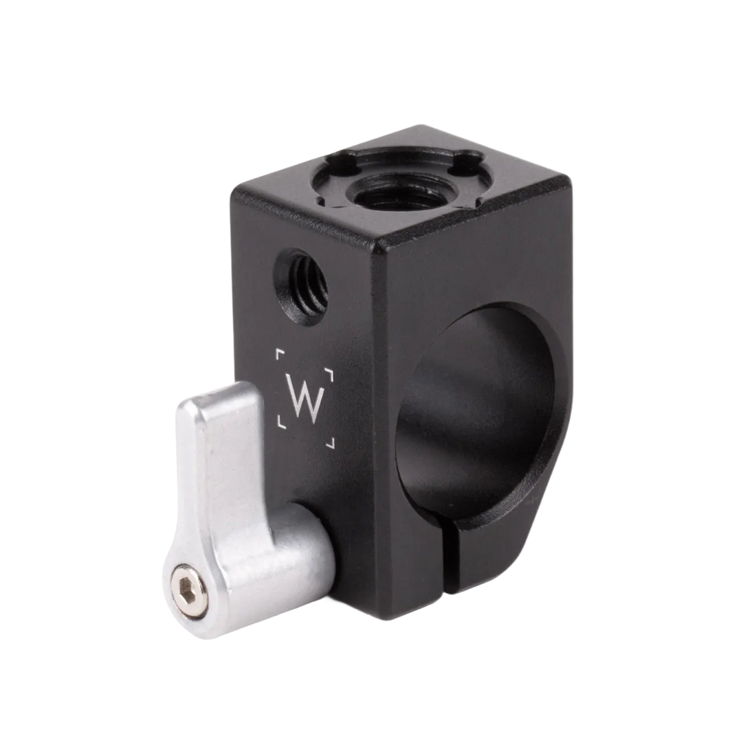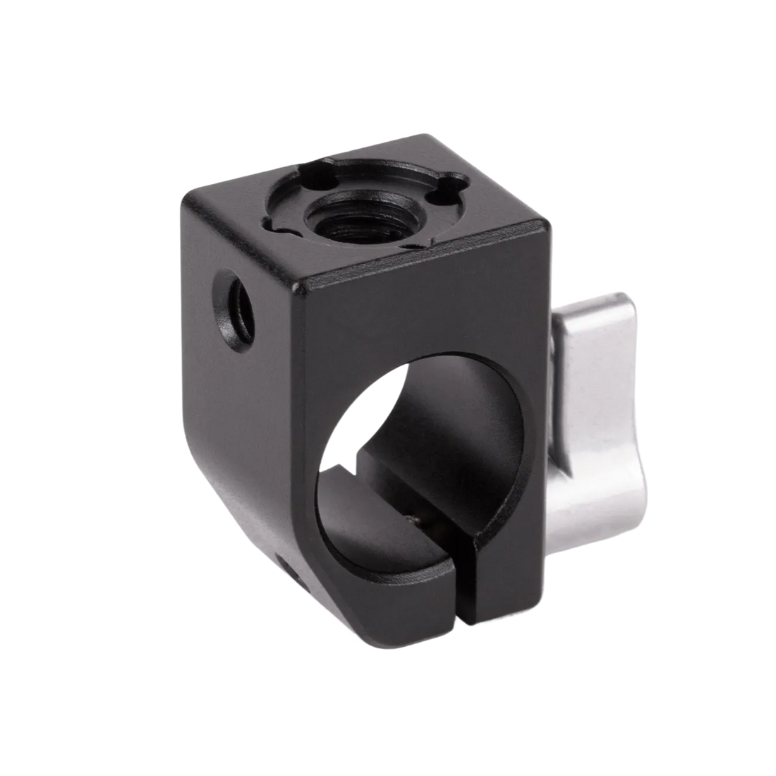 19mm Rod Clamp to ARRI Accessory Mount attaches to a 19mm rod and provides an ARRI standard accessory mount. In addition to the 3/8"-16 hole, 1/4"-20 holes are present on each side for attaching additional accessories.