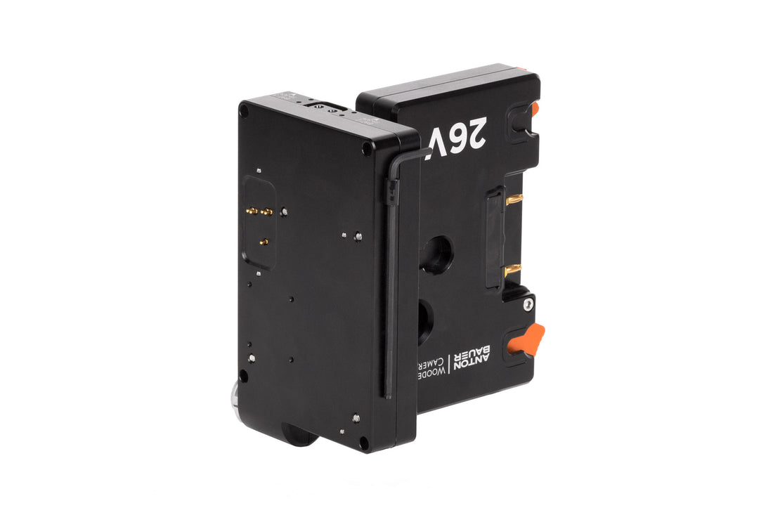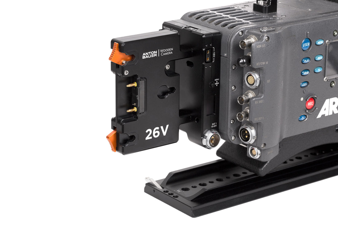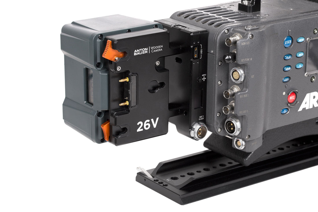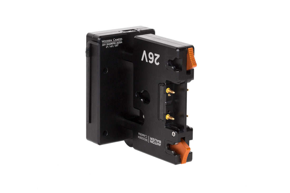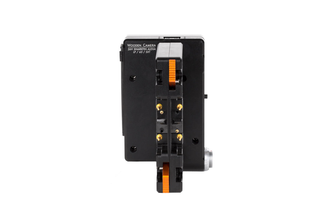 Wooden Camera / Anton Bauer 26V Sharkfin Gold Mount Plus (Alexa LF, 65, SXT) attaches two 26V batteries in a Sharkfin configuration directly to the back of the ARRI Alexa LF, 65, SXT, and every Alexa down to the Classic EV to provide power through the rear battery contacts without cables. Internal circuit board prioritizes the 2pin Fischer DC Input, allowing 24V block batteries to be used first, leaving the on-board batteries fully charged. Hot swapping between battery sources is possible and OLED screen on side panel provides voltage data, battery capacity, and active source information. Two Power Taps are provided at a regulated 15V and current is monitored. Should the user exceed the current threshold, the plate will cut power to the P-Taps, leaving the camera operating normally. A warning message will appear on the OLED screen and the user can reset it using the menu button.