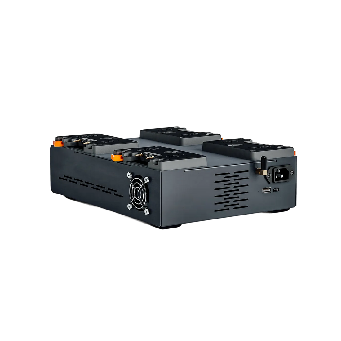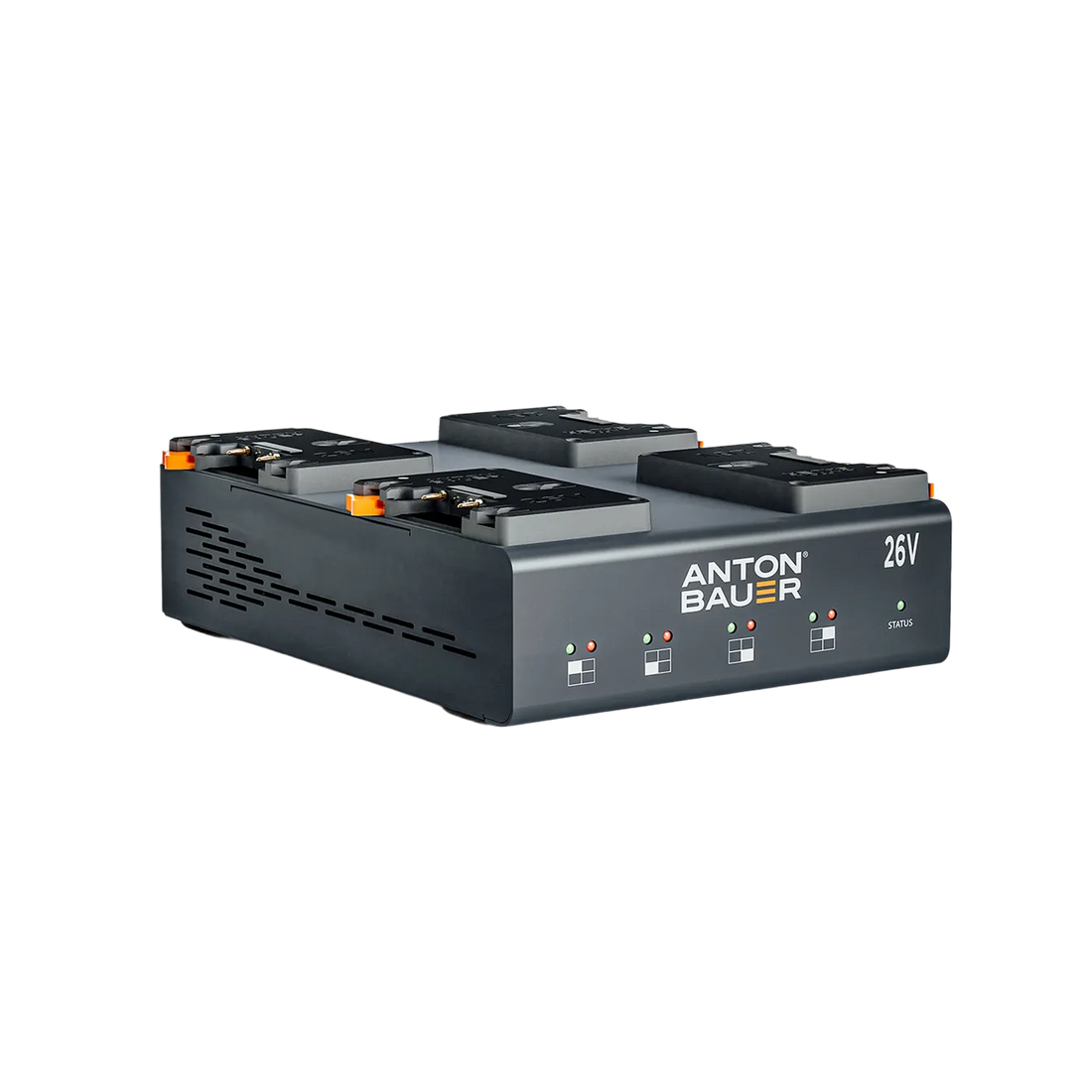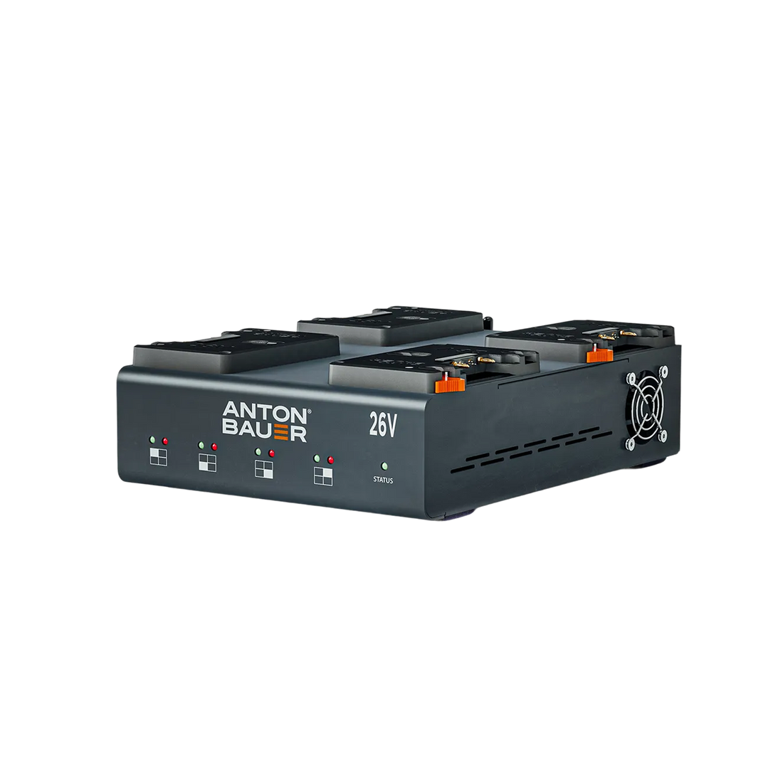 Anton/Bauer Dionic 26V LP4 Quad Gold Mount Plus Charger is a four position simultaneous 26V charger that will provide rapid charge for 26V or 14.4V batteries. It supports Gold Mount and Gold Mount Plus batteries and utilizes a USB flash drive for firmware updates.