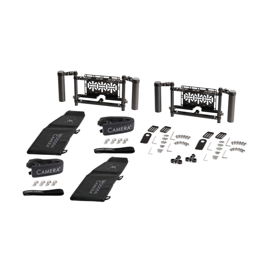 The Dual Director's Monitor Cage v3 is engineered to be universally compatible with any monitor up to 9 inches (measured diagonally) and attaches via top, bottom, or rear 1/4-20 mounting locations. New design provides 33% weight reduction compared to the previous model and adds unique new features like a dual direction swing away bracket, quick release neck strap, dual Teradek mounting areas, and carbon fiber rods and handles.