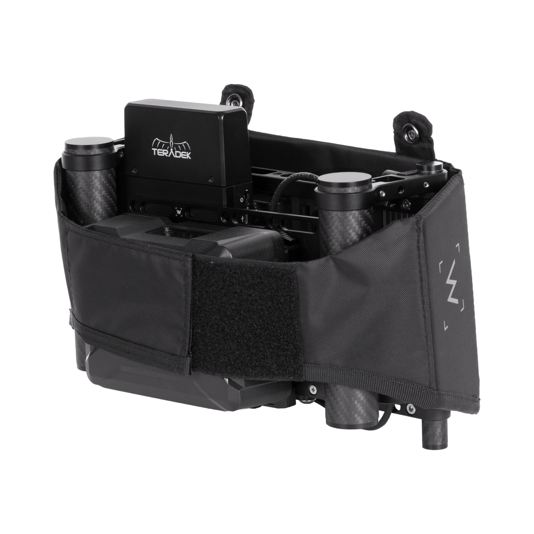 The tool-less design of the handles allow them to be folded in for easy packing and the sun shade can be repurposed to act as a protective cover. Also included is a padded neck strap with 4 mounting points and quick release clips, Teradek mounting areas that allow up to two wireless receivers to be mounted side by side, and a cable tie for cable management.