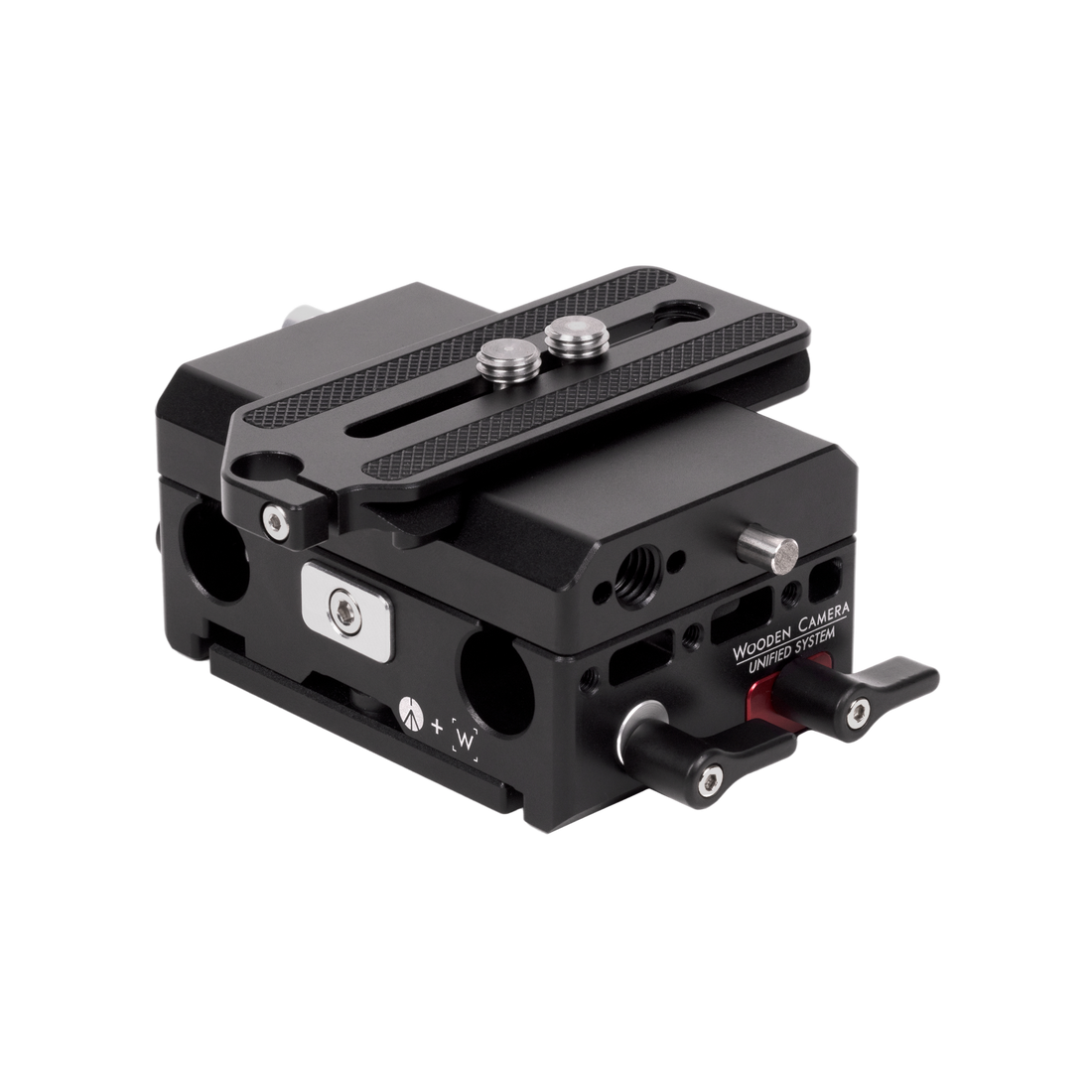 Quick release baseplate that provides lightweight 15mm rod support at the correct lens height. 15mm rods pass through front to back and have two locking thumb screws per side. The baseplate quick releases in two ways, giving the user the option to take the 15mm lightweight rods or to leave them behind.