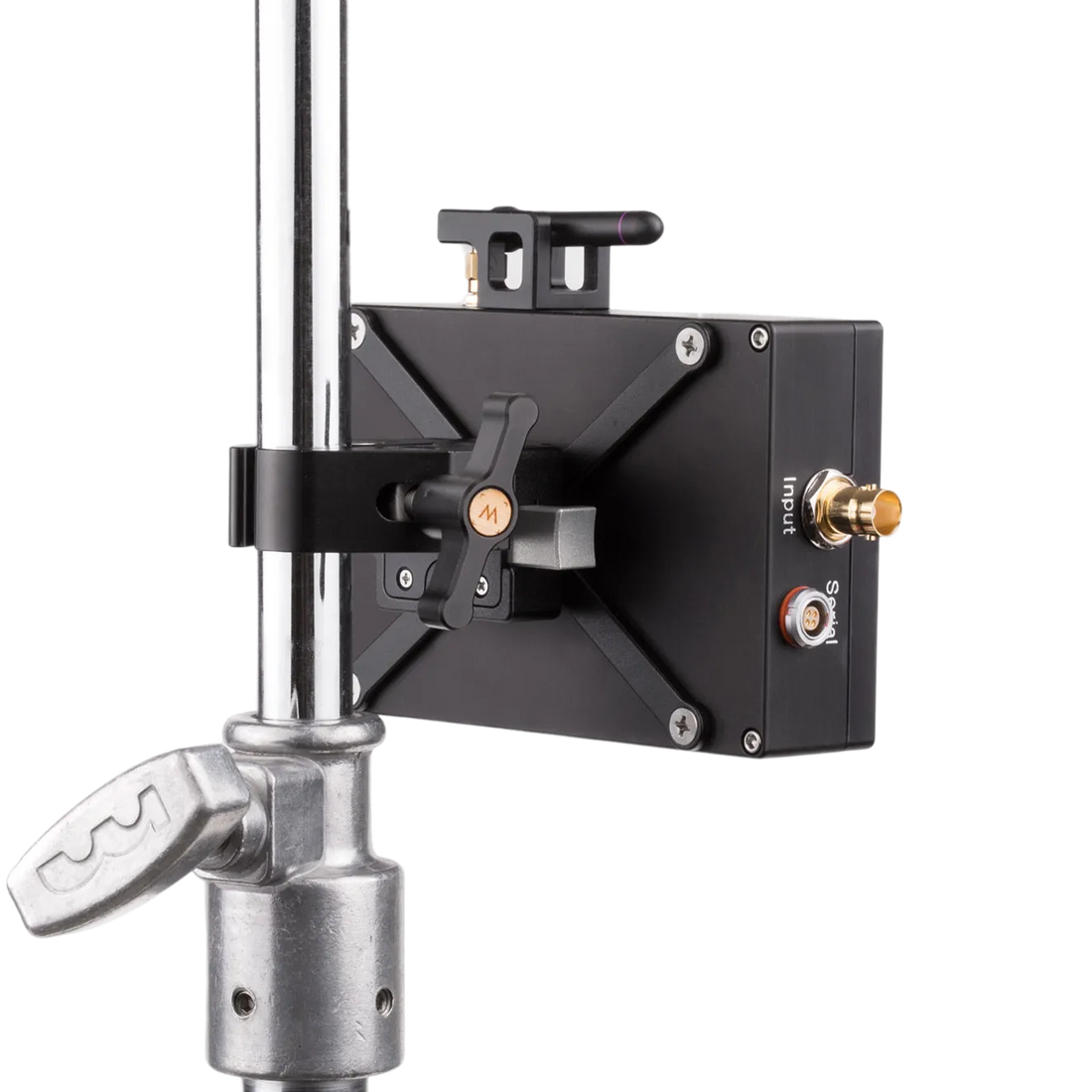 Preston Light Ranger 2 VOU Mounting Kit allows you to attach the VOU to the same stand that the larger production monitor would be mounted. Includes a bracket with V-Lock Wedge that attaches to the VOU and a V-Lock Base Station mounted to a WC Super Clamp. The clamp's jaws can open wide enough to attach to any part of a C-Stand.