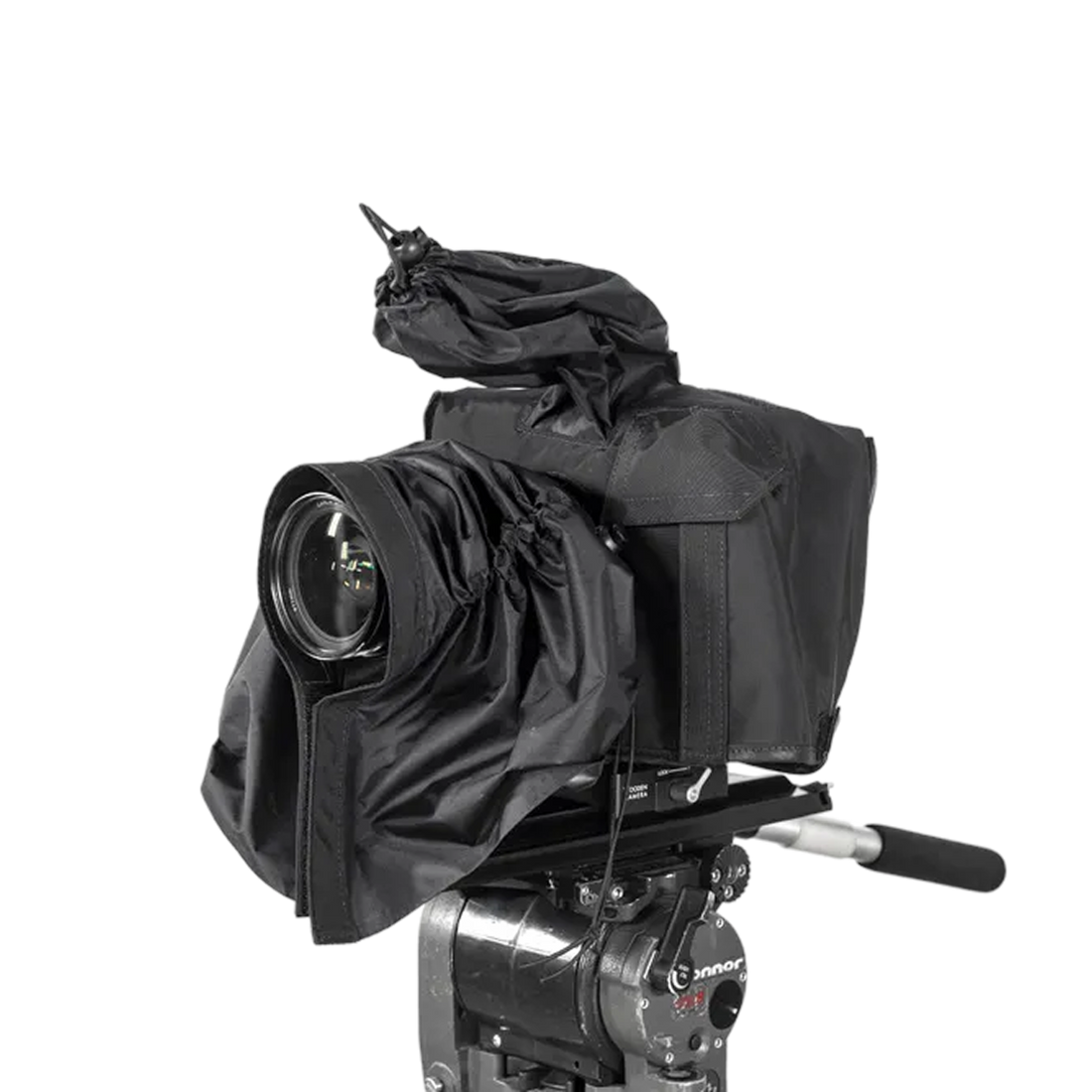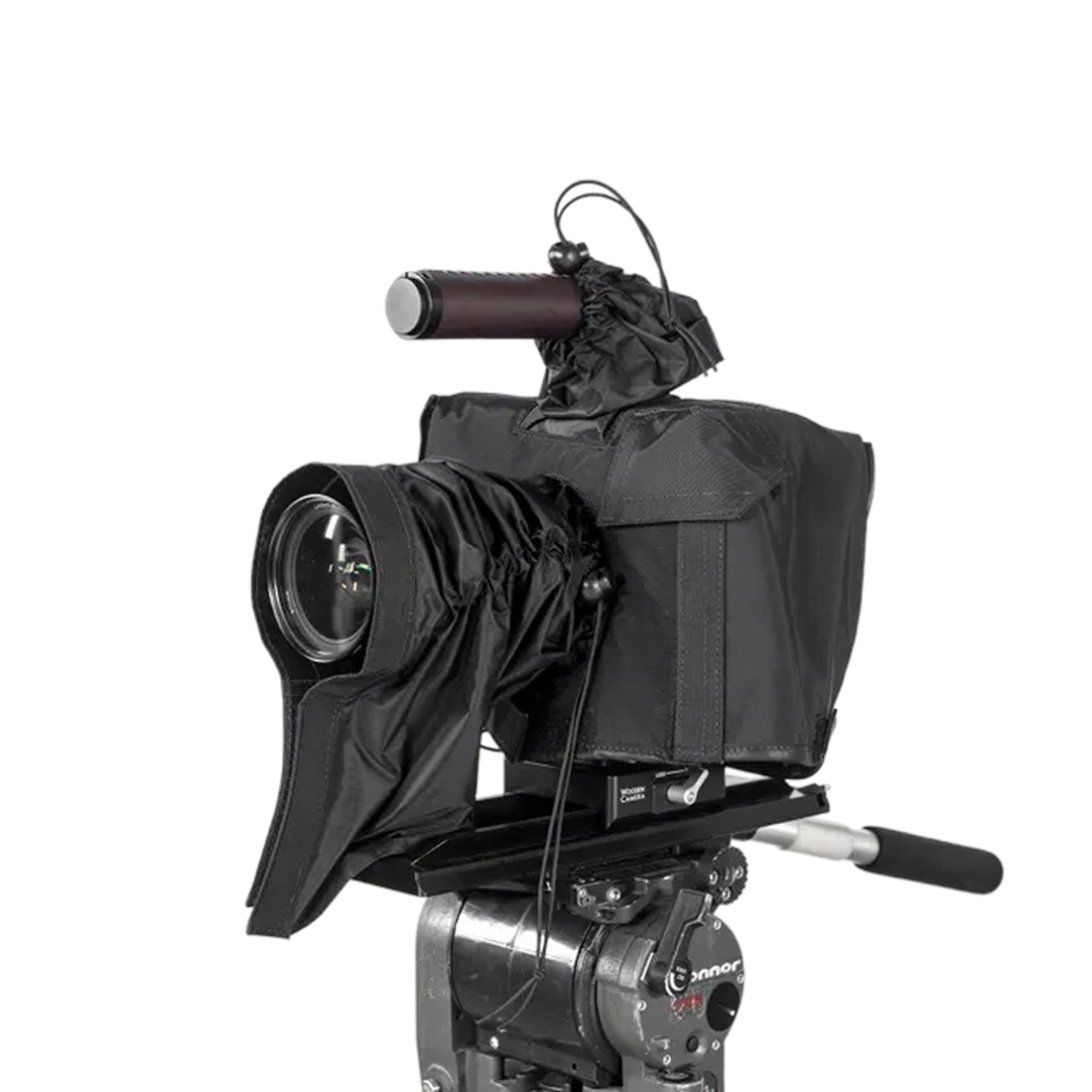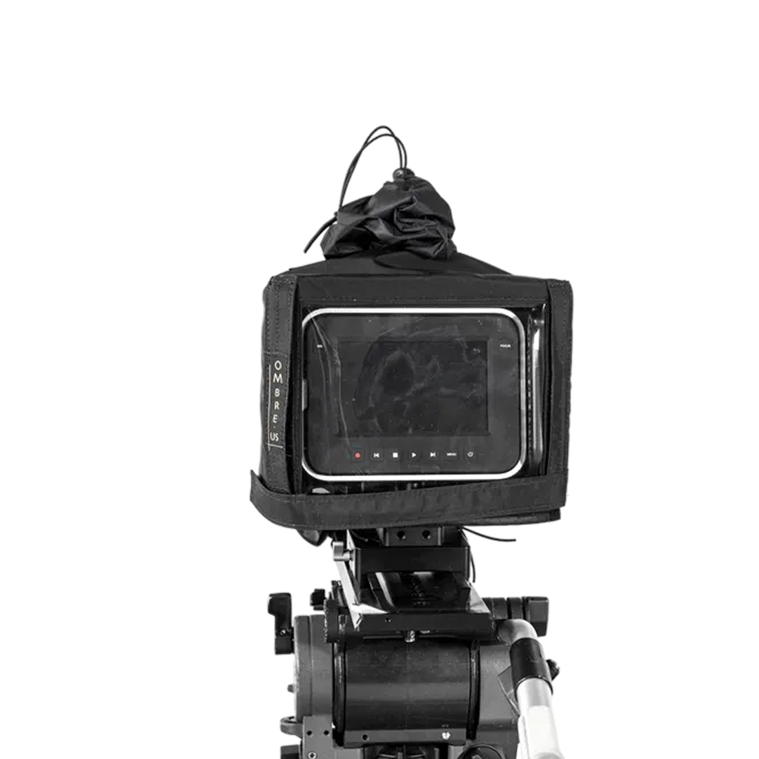 Rain Cover (Blackmagic) was designed and manufactured by Ombre.us and form fits to the Blackmagic Cinema Camera. The cover features a see through plastic window for viewing rear LCD Touchscreen and a cinching top sleeve that will accomodate NATO Handles and Top Handles attached in any direction. Top port patch allows feeding of cable upward out of Rain Cover if desired. The expanding and cinching front sleeve allows attachment of lenses with wide ranges of focal lengths.
