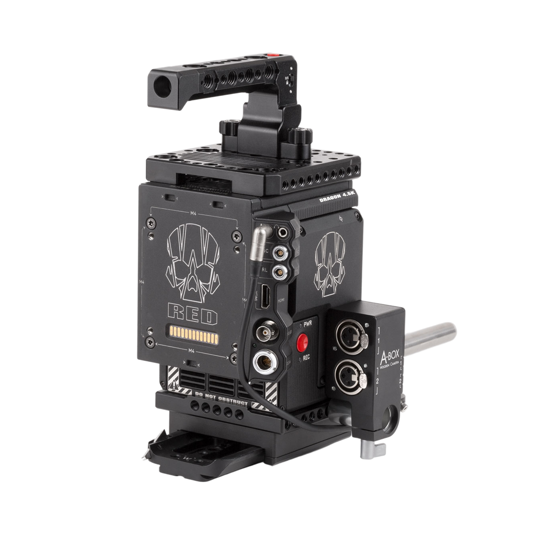 The Dovetail Clamp, located on the bottom, is an ARRI standard dovetail interface that attaches to the included Safety Dovetail (8") to allow for quick install and removal, as well as counterbalancing. The A-Box (RED® DSMC2™) plugs into the RED® Base Expander Module and converts the 3.5mm microphone input into two industry standard XLRs. Note that the Base Expander Module is required for the A-Box to function and phantom power is not available.