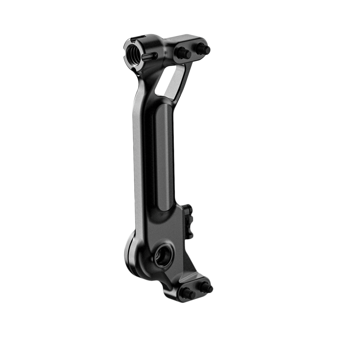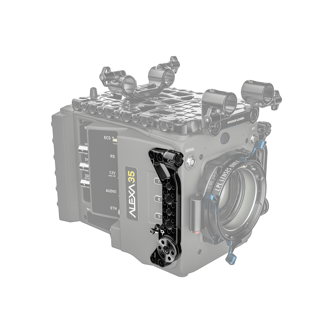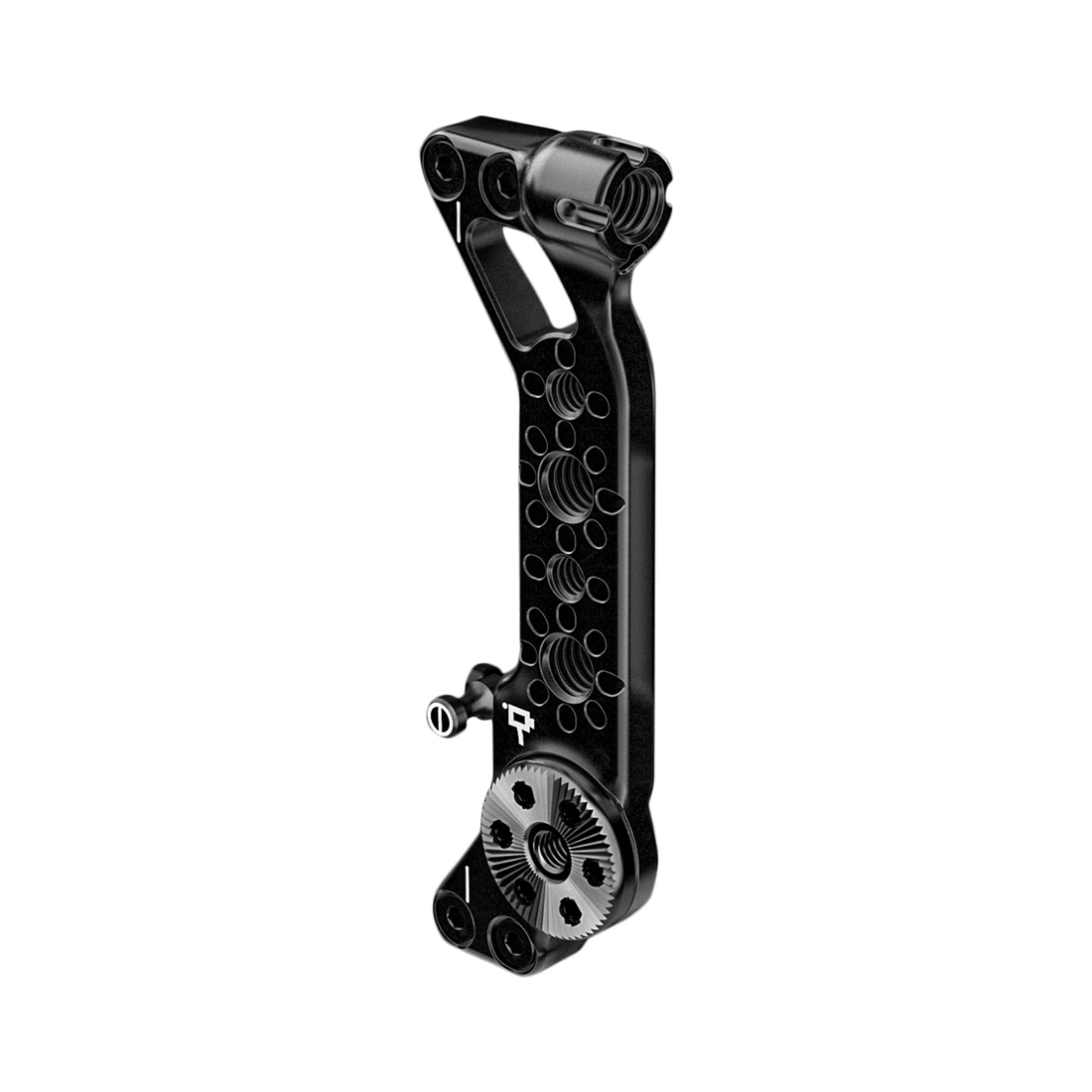 Side Rail that mounts to the right side of the sensor body, featuring a DLC-coated stainless steel rosette, a forward-facing ⅜”-16 mounting point, 2 x ⅜”-16 and 2 x ¼”-20 mounting points, a sensor-plane mark, and a swing-out tape hook.