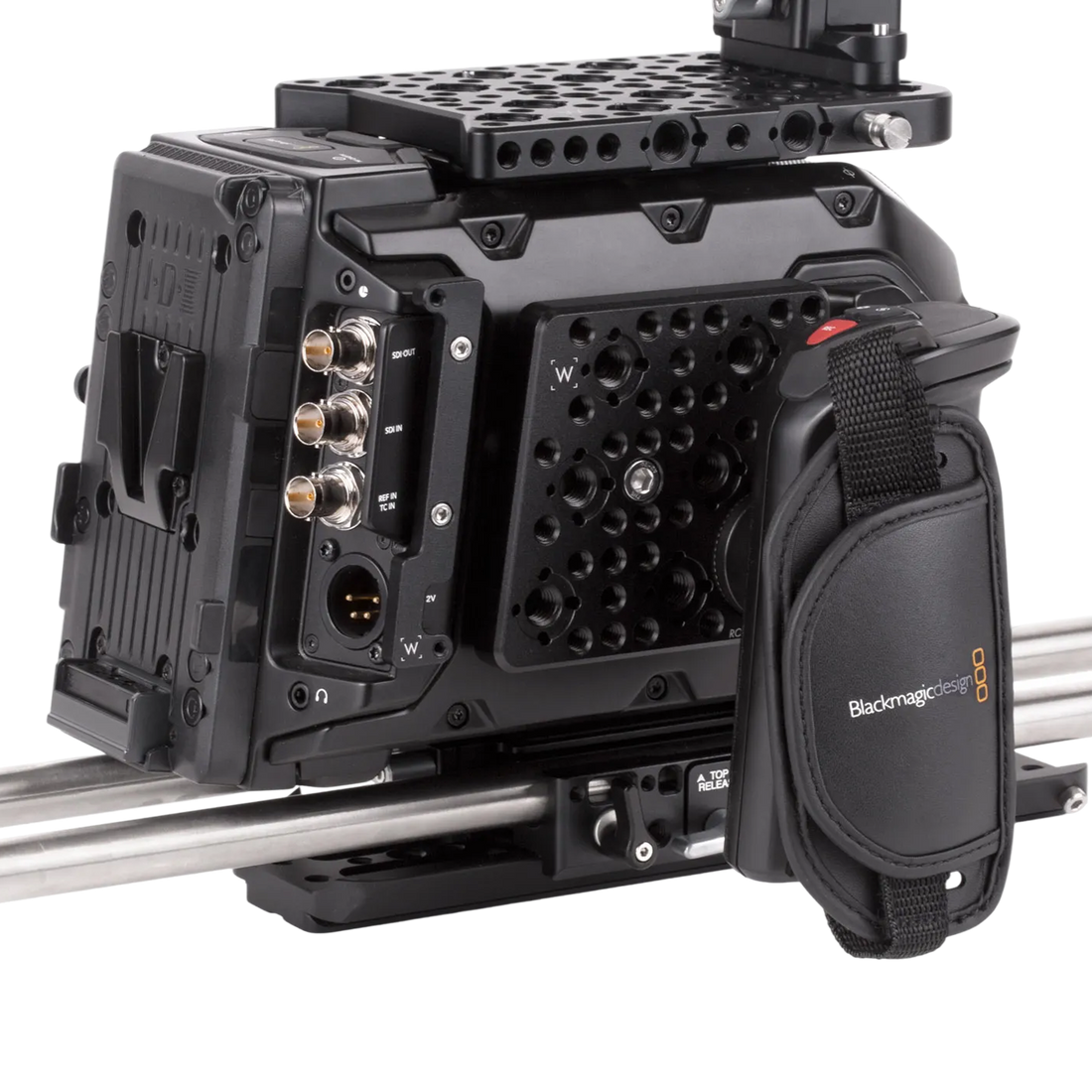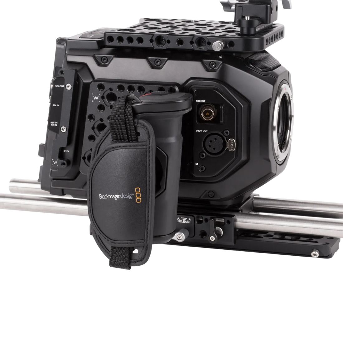 Rosette Side Plate (URSA Mini, URSA Mini Pro / 12K) attaches to the right side of the Blackmagic URSA Mini and URSA Mini Pro /12K cameras by the ARRI rosette to add additional 1/4"-20 and 3/8"-16 mounting points. An ARRI standard rosette is available for attaching the handgrip or extension arm. ARRI accessory mount also available in several places (3/8"-16 screw hole with locating pins adjacent).