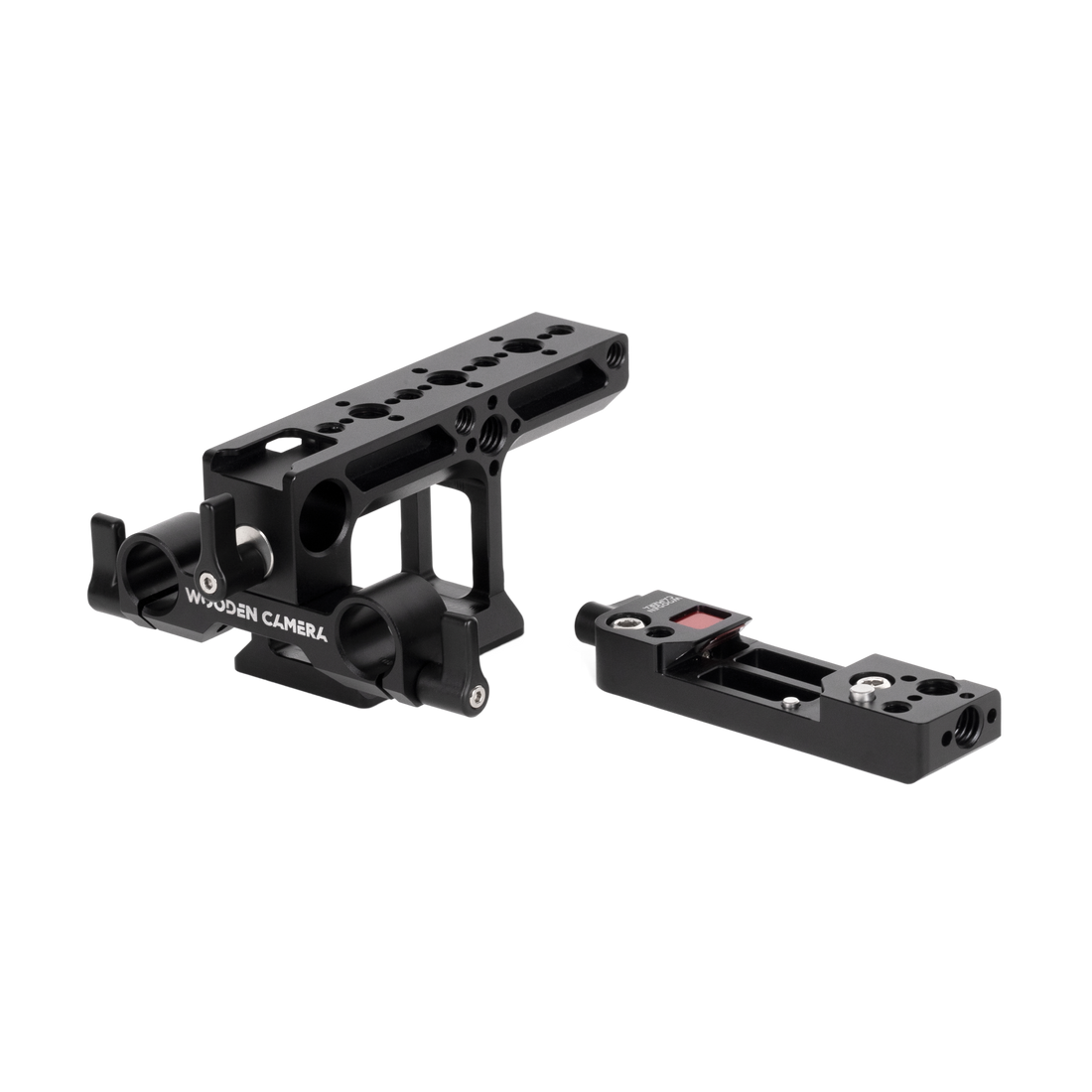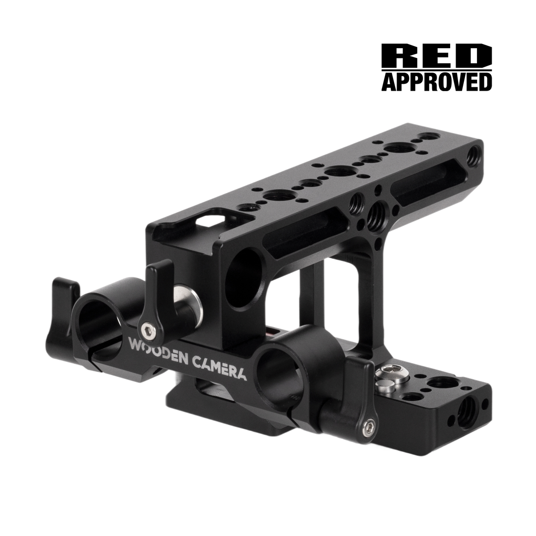Included Top Handle slides into ARCA slot and leaves camera control screen easily accessible. Shoe mount on top can hold on-camera lights and microphones and side 15mm opening can hold UVF Mount V2. 1/4-20 and 3/8-16 ARRI accessory mount in several places and 15mm lightweight rod bracket on front for attaching lens motors and more.