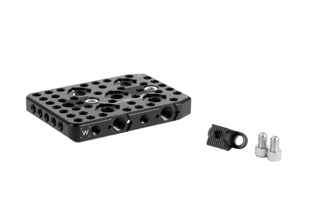 The Top Plate (Short) for Canon C200 and C200B cameras has arrays of 1/4-20 holes in standard spacing and ARRI Accessory Mount in several places (3/8-16 threaded hole with locating pins adjacent). This short version of the C200/C200B Top Plate allows for full range of viewfinder motion. 1/4-20's available and marked for the camera's included handle and the Master Top Handle. Also included with the Top Plate is a Canon C200 / C200B EVF Bracket Adapter which allows you to reinstall the L bracket and LCD that comes with the camera. This piece can be attached to the front of the Top Plate or to the front of Wooden Camera NATO Handles.