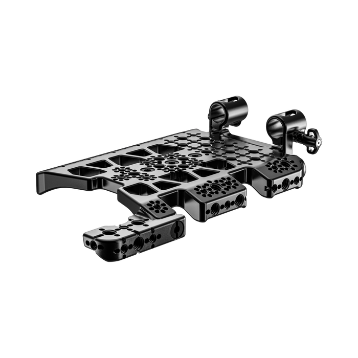The Top Plate System designed for the Blackmagic URSA Cine 12K/17K incorporates open ports emphasizing airflow. It includes the Top Plate, Front Dual Rod Clamp, and Top Plate Extension Block.