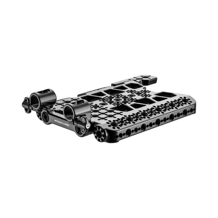 This system securely mounts to the top of the camera using three 1/4"-20 screws down the center of the camera and adds multiple 1/4"-20 and 3/8"-16 mounting points across the top and sides of the plate. With the front-facing 3/8"-16 mounting points, users can add the included Front Dual Rod Clamp to secure 15mm rods for accessories like EVFs or lens motors. Forward-facing 3/8"-16 mounting points allow users to add accessories like Bolt-On Rods for lens motors.