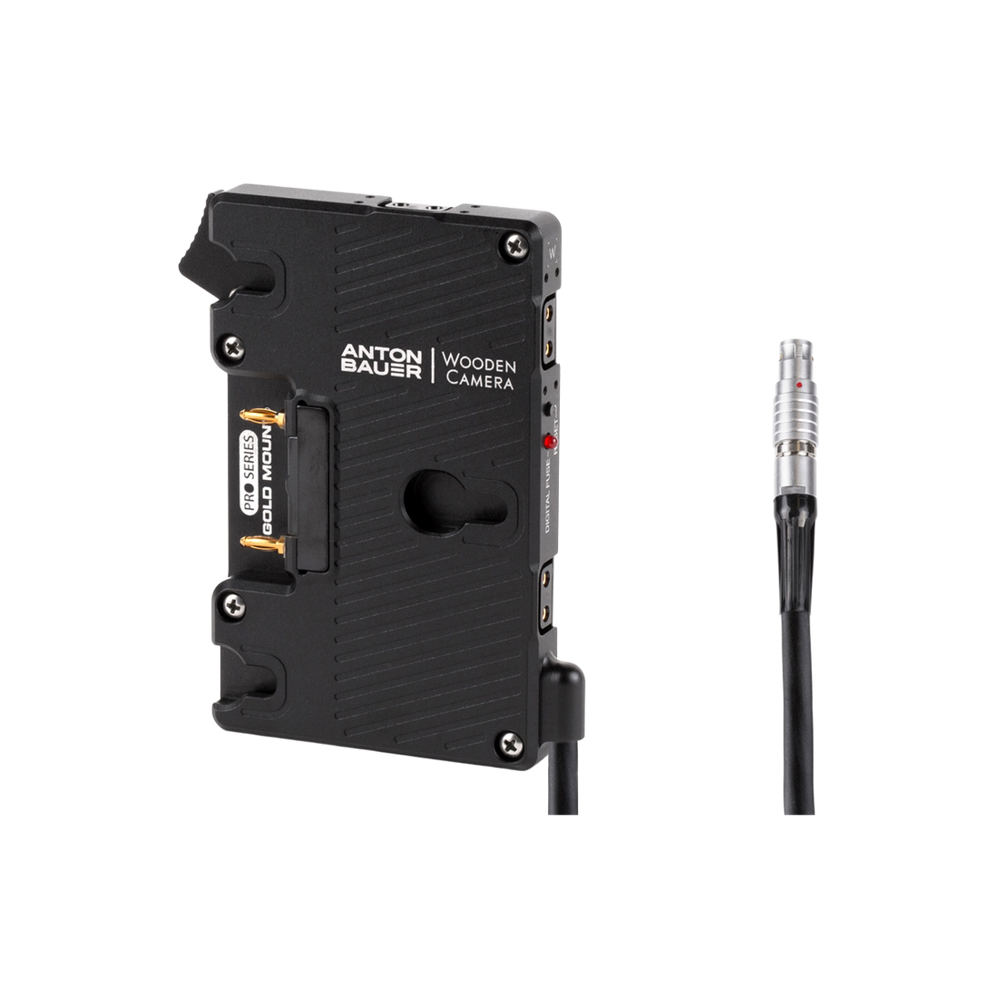 WC Pro Gold Mount (Canon C200, C200B, C300mkII) is a metal power plate, created in partnership with Anton Bauer, and has a rugged aluminum body for durability and secure battery mounting and a Canon C300mkII, C200, C200B connector. Features 3x D-Taps for accessory power at battery voltage (12-16V), a digital fuse with reset button, rear cover plate, and captive mounting screws.