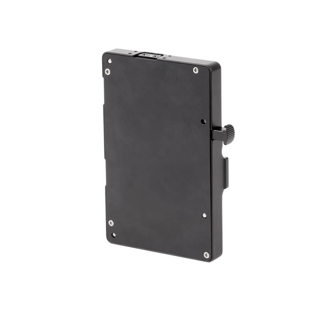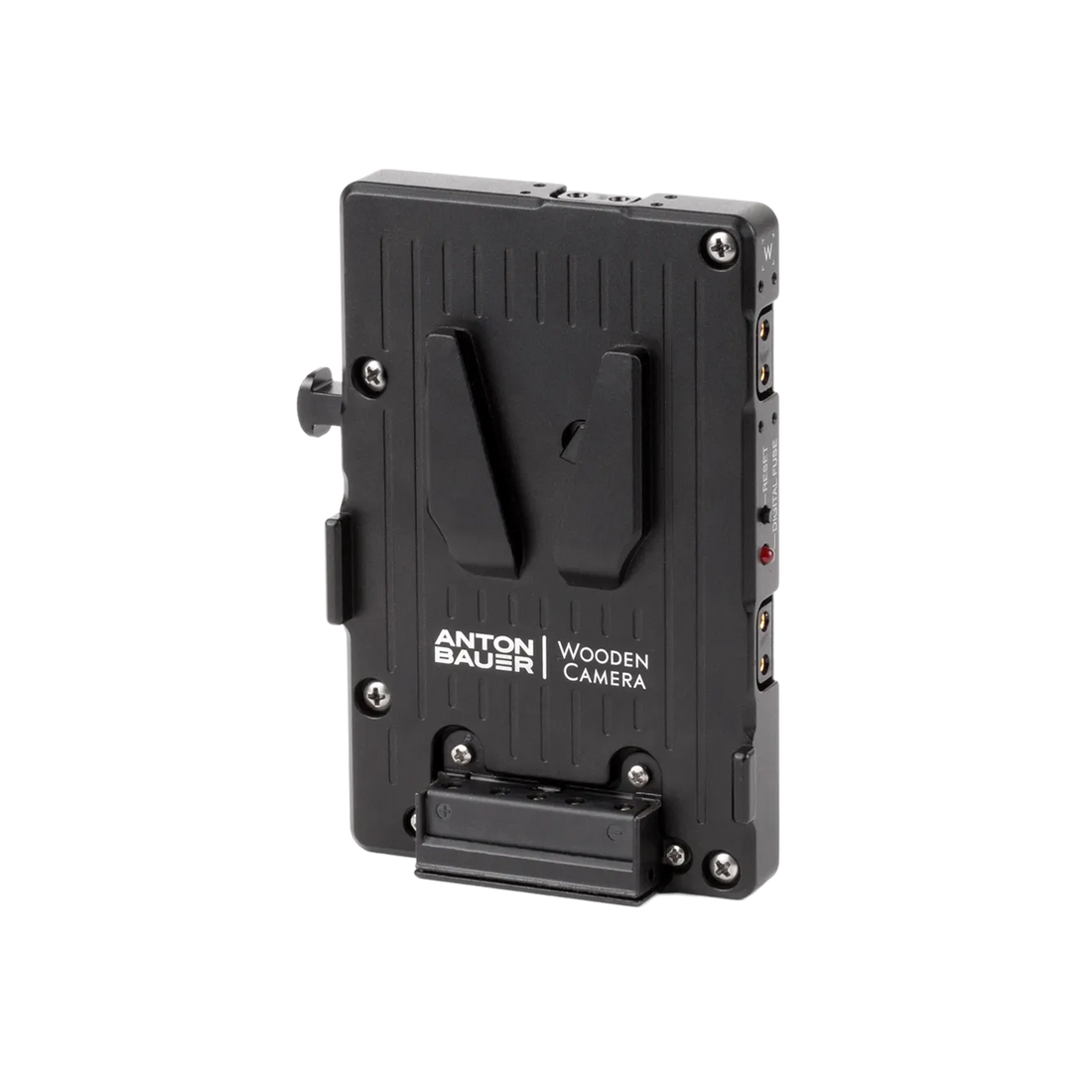 Wooden Camera brand Pro V-Mount plate is a metal power plate, created in partnership with Anton Bauer, and has a rugged aluminum body for durability and secure battery mounting. Features 3x D-Taps for accessory power at battery voltage (12-16V), a digital fuse with reset button, rear cover plate, and captive mounting screws. Should the user exceed the set current for accessories, only the accessory outputs are disabled leaving the camera running normally. Once the current load has been reduced by either removing accessories or reconfiguring, the reset button can be pressed to enable accessory power again.