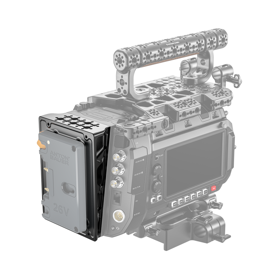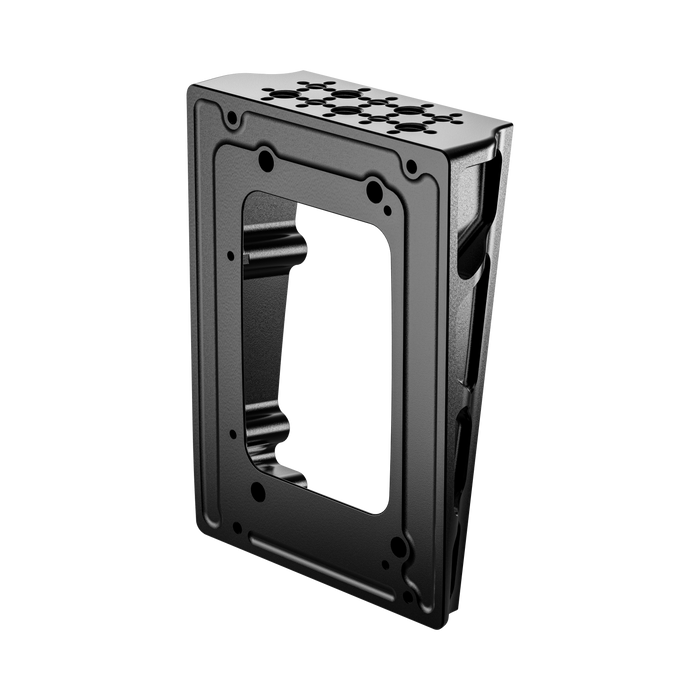 This wedge mounts directly to the back of the camera. In addition, ¼”-20 and ⅜”-16 mounting points are added to the top of the wedge enabling additional options for mounting accessories to the build. The design of the wedge accents the camera's body design.