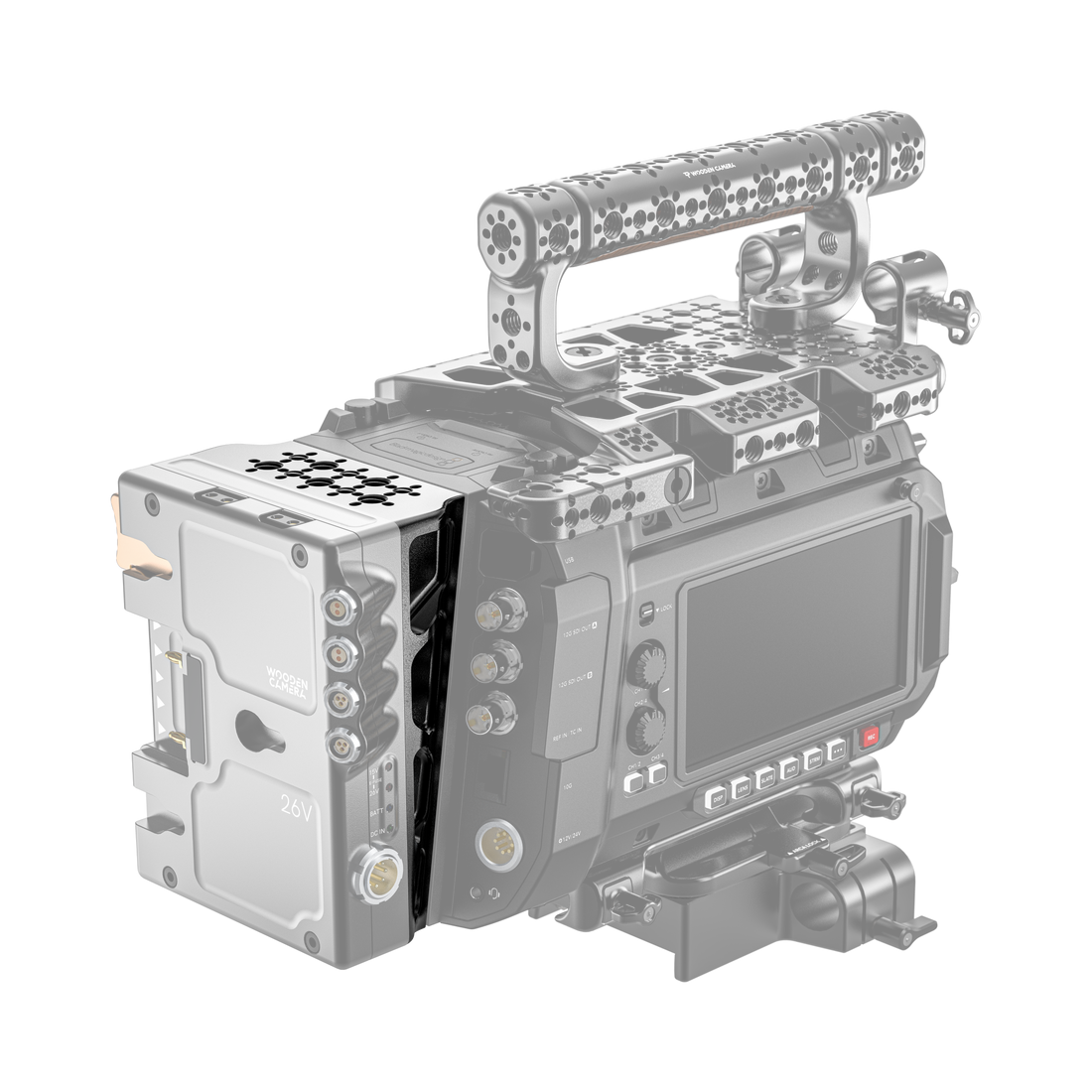 The Wedge sets the camera's battery plate perpendicular to the camera, allowing the Wooden Camera D-Box®, the Anton Bauer Gold Mount Plus Plate, and Blackmagic URSA Cine 12K/17K Battery Plates to mount additional accessories in line with your camera setup. This becomes important when the battery plates have cradles attached or other accessories that extend the camera's length towards the back.