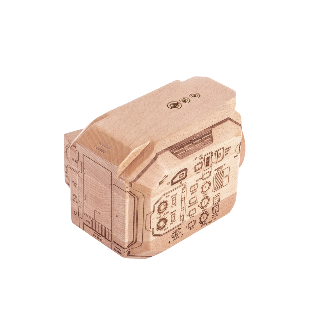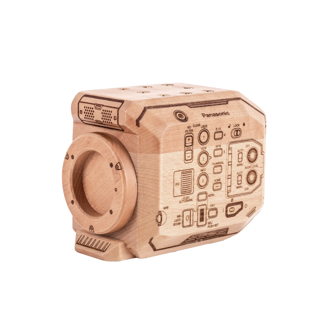 This is a wood representation of the Panasonic EVA1 with most of the mounting points that you would find on the camera. This wooden model features (8) 1/4"-20 threaded holes on top of the camera, as well as (2) 1/4"-20 holes and (1) 3/8"-16 hole on the bottom. Native Panasonic side handle mount not included on model. The weight is about a 1/2 pound heavier than the actual EVA1 body.